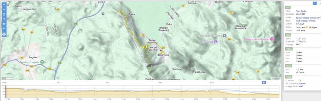 Ko se jaz matram sem in tja v res zbutani termiki pred kočo (močni sunki me kar mečejo gor v sedežu), so predhodniki že v višavah. Ko pa se premaknem bolj proti pašniku na platojčku, pa tudi jaz vdenem pravi steber in me ekspresno dviguje; višje pa že kar izstreli proti 2000 (max +8, kar nekajkrat vidim +6, +6,5…). Ko sem čez 2000, se začnem umikati ven iz dviganja (po novem je plafon na 2160), pa mi pokaže že 2250 preden se res začnem spuščati. Proti Javornikom vidim Mega že dosti nižjega, pa se tudi tam pobere in počasi odpelje proti domu.