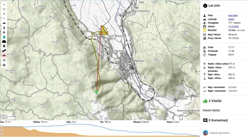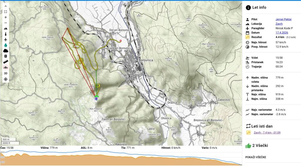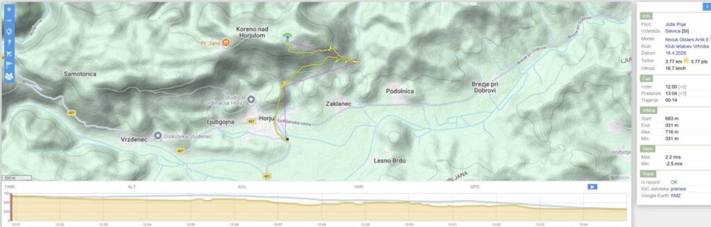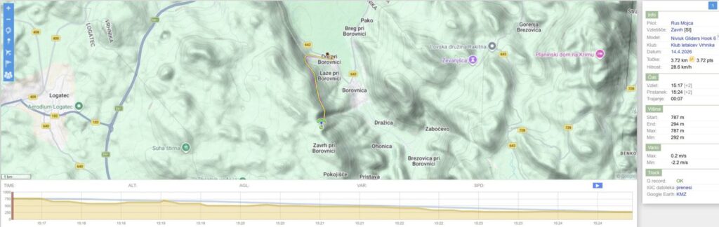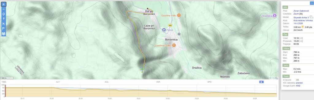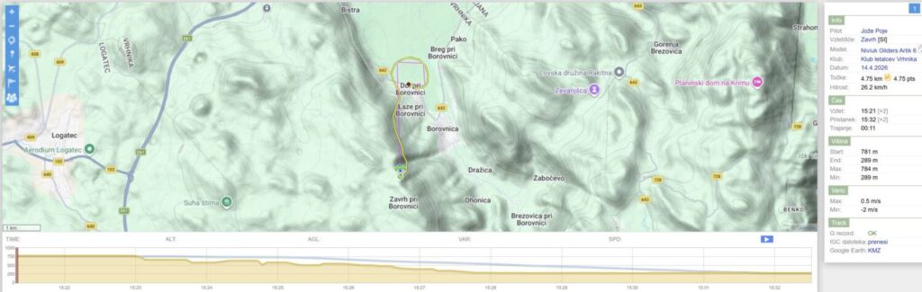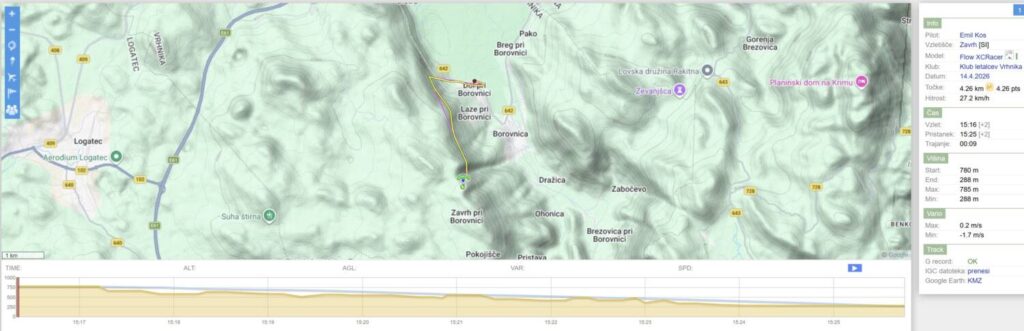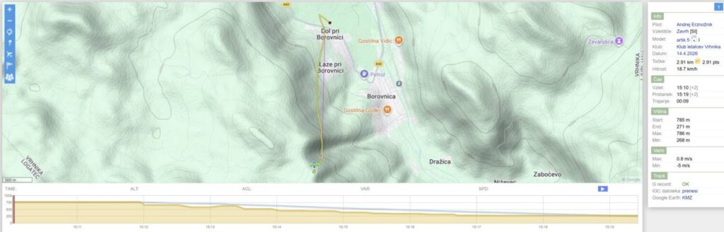 Na Trebelniku naberem na 1100 in v dviganjih in spuščanjih visoko do Javorča in nad njim obrat in z nabiranjem nazaj. Pred Dolom imam skoraj 1300, pa v močni borbi proti vetru scurim malo pod štart (vidim, da na štartu kar močno piha), tako da ne rinem več naprej proti Anteni.