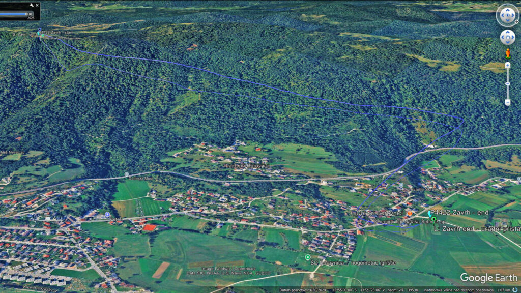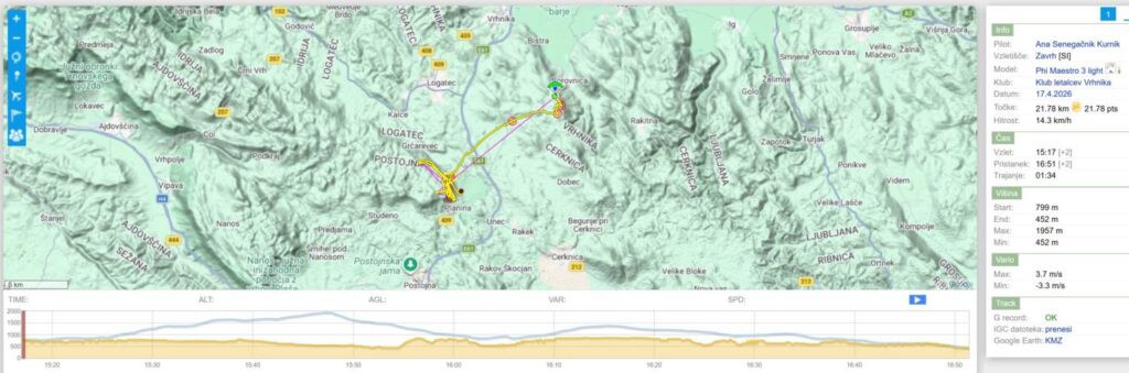Drugo rundo nazaj sem dosti nižji, predvsem pa je vse, tu nižje, pošteno razgonjeno in padalo občasno nosi kar po svoje… Spet obrnem na Javorču in rinem nazaj v veter tudi samo 15, da se pred Dolom odločim, da neham riniti naprej proti pristanku, ampak obrnem spet proti Javorču, pred njim naberem do 1200 in se odpeljem čez AC in Vrhniko (kjer me spet dvigne brez pobiranja) s 50+ dokaj razbutano do vstopa v Podlipsko. Tu pa v bolj mirnem in še vedno močnem vetru s 60+ v Podlipsko, v hvaležnosti, da me počasi in sigurno spušča.