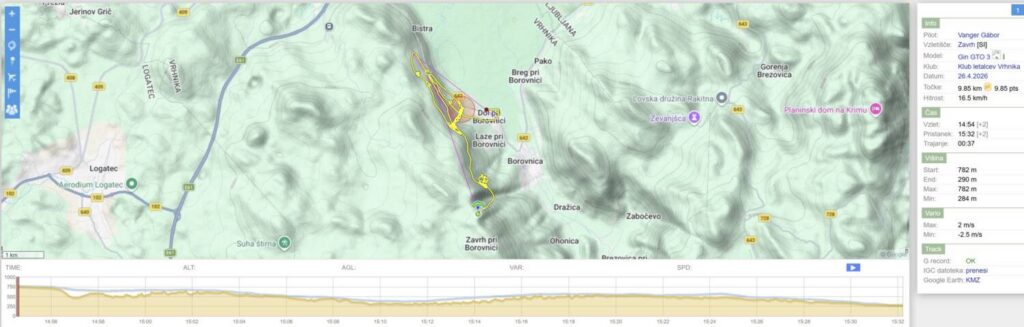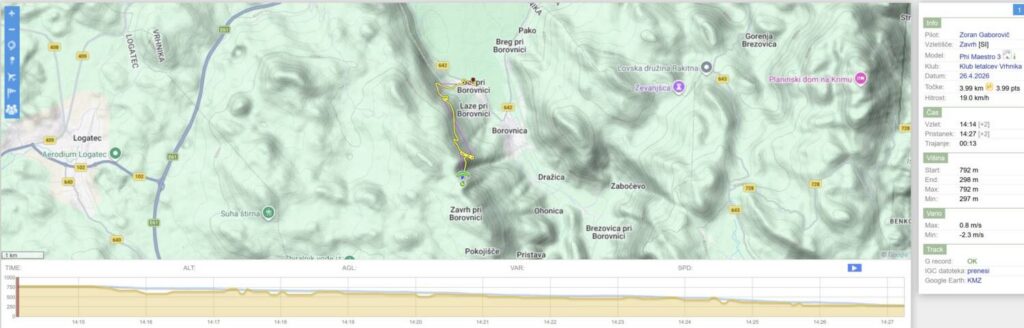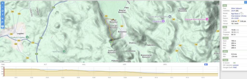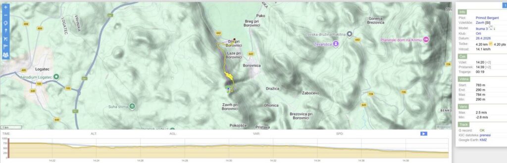 Tom Pavlič : Kot prvo vse najboljše Zoki! … Da ne pozabim Kakšen dan. Sonde prvo curijo, mi pa opazujemo. Ko določimo, da je pravi cajt, začne pihati dol. Super. No, nekako štartam in začne matranje… Šele po slabi uri naberem nad greben. Uf. Poskusim še malo proti štartu, pa ne dela. Vidim da nekaj nabirajo zunaj, pa poskusim še jaz. Nekaj pisketa, pol me pa požere. Pristajam. Sicer pridem na vznožje hriba, ampak na višini zadnjih krošenj. Nakar rekordni low save. Ne vem koliko sem bil nad tlemi, ampak tako nizko se še nisem rešil. Naberem na 2k, ampak nad 1500 je bilo treba že fajn lovit padalo. Ker sem hotel ostati v tem peskovniku, grem malo proti vetru. A melje kot pr norcih. Šele daleč nad dolino se mi pulz spet malo umiri. Na koncu pa itak ni hotelo dol. Uh. Po 12h letih spet na Zavrhu, in vesel kot radio [18.4.2026 16:36]