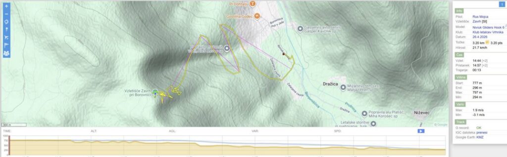 Igor : H&F. Prvi današnji. Za slabe pogoje na Zavrhu mora biti izpolnjen vsaj eden od spodaj naštetih pogojev. Če sa po vsi trije hkrati, se na Zavrh ne hodi 🤣🤣🤣: 1.Napovedana dobra termika z le 2-3 m/s SV. 2.Pojavi se en kup pilotov ker “danes bo ta dan”. 3.Dan prej se odlično leti na Zavrhu. Hvala Aleš padalec z BMW., za dostavo od Viadukta do Škorpiona. [18.4.2026 19:09]