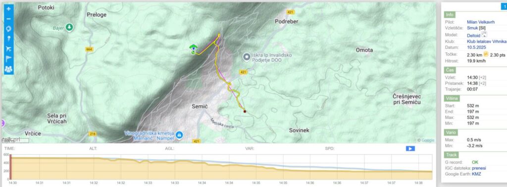 Sprva je okoli Podrte malo razgibano, vendar vse lepo drži. In potem se samo še vozim(o) nad grebenom do Hublja in do konca v kot (praktično brez vrtenja). Nazaj gre sprva bolj počasi, pa vedno pravočasno dvigne in večinoma nad grebenom vozim spet nazaj na start in še čez.