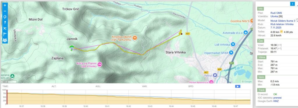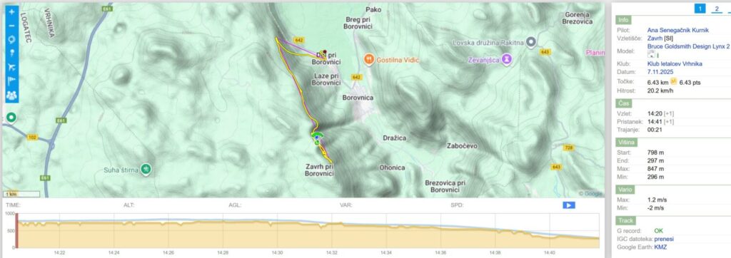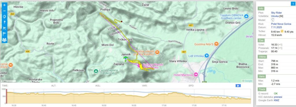 Roman Debevec : Spet nekdo, ki me je vstrajno klicaru, medtem ko sem bil v zraku in mi zdrmu flyme da je spet crknu… 🙉 Lepo se je dalo pojadrat še na Javorču, pristal pa kot zadnji pr Škorpjonu ob 15.48… Hvala vsemu za družbo in Milanu za prevoz!🙏 [8.11.2025 17:52]