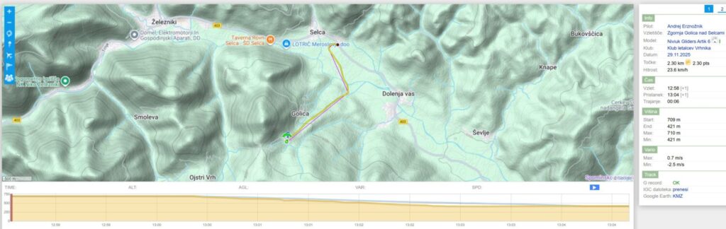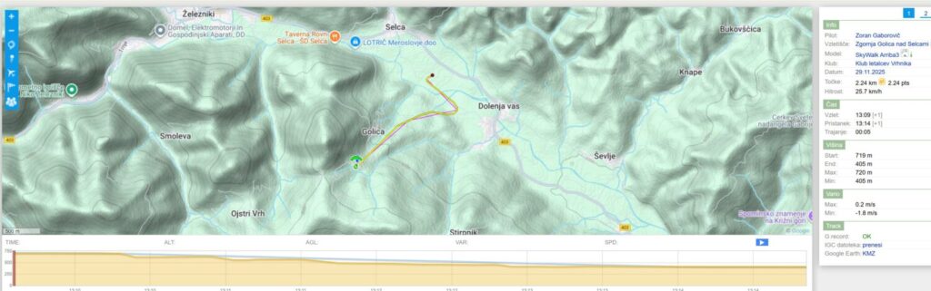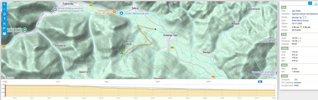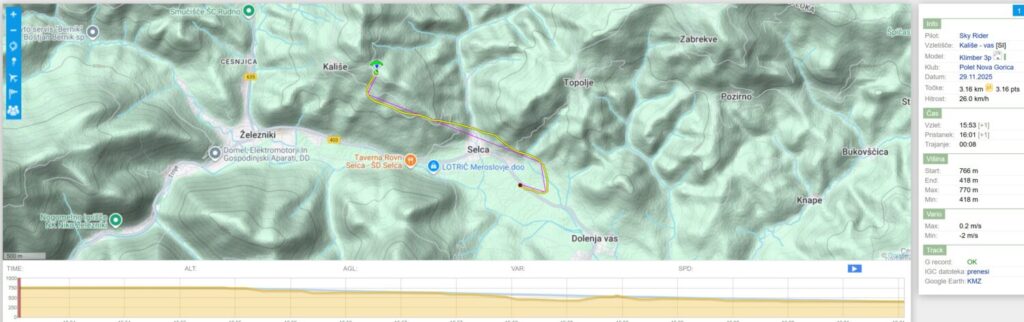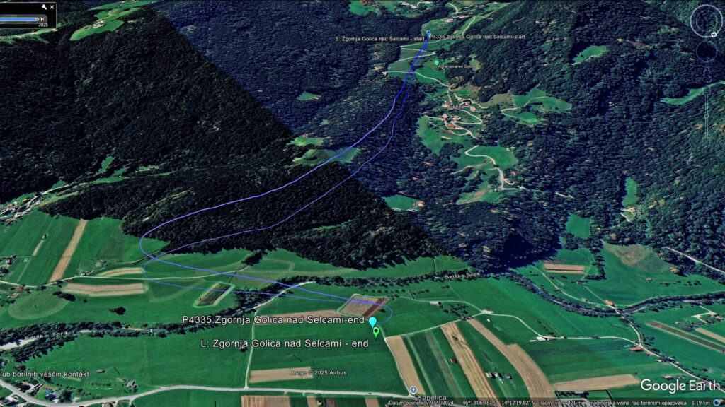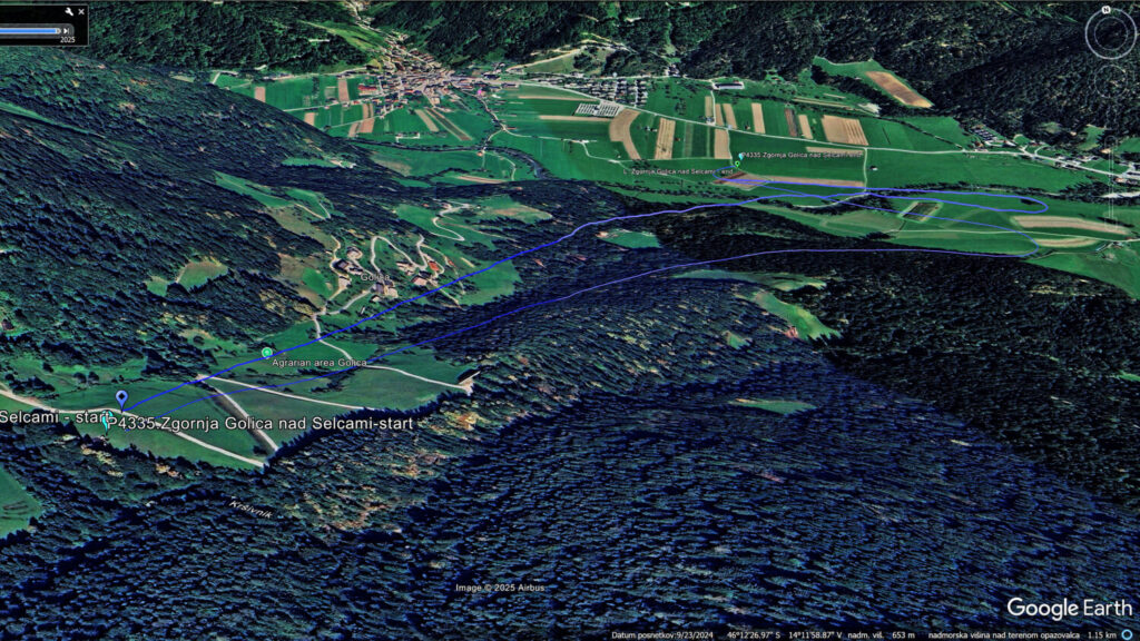 Popolnoma miren let po putru bogato nad gozdovi v smeri Dolenje vasi in zavoj nad sončno dolino, da na koncu nežno pristanem na travnikih pred daljnovodom.