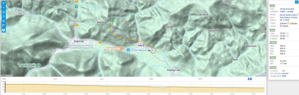 Tako se odpeljeva dol do pokopališča, kjer naju pričaka Boris. Erzo je že odšel v Železnike na prireditev (medtem je tudi nekaj udeležencev odletelo z Ratitovca in smo jih videli v zraku), mi 3je pa (s postankom na kavici v praznično razsvetljeni Škofji Loki) naprej proti domu…